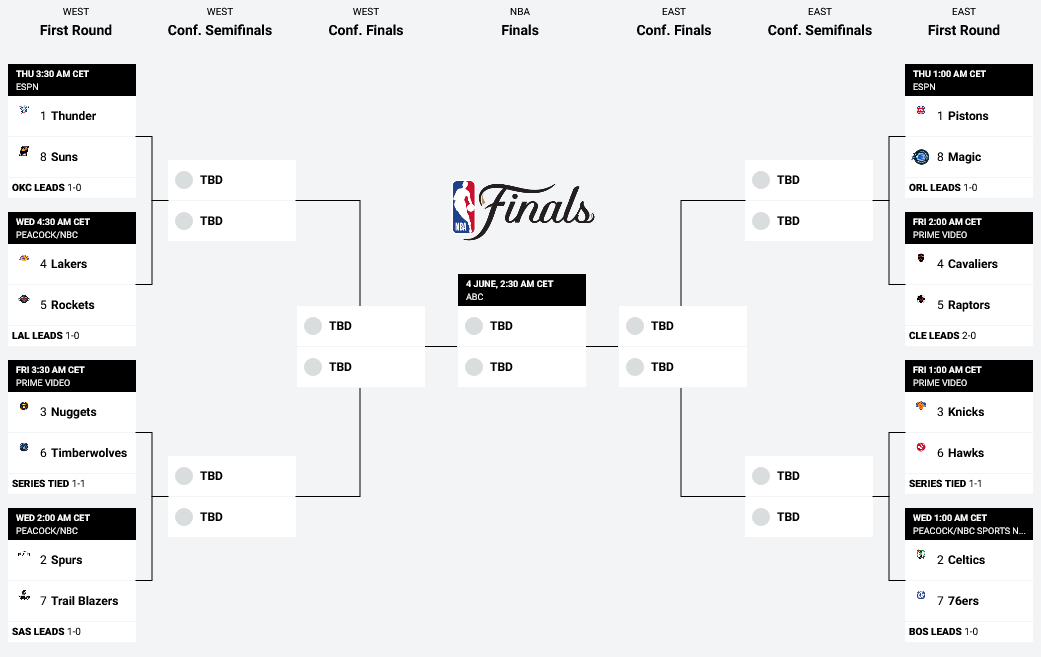 The Conference Semifinals begin when all four first-round series conclude, and it’s expected to begin around early May. Conference Finals matchups start approximately two weeks later. The NBA Finals open June 3, 2026.