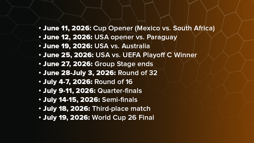 And for the first time in history, the Cup will be hosted by three countries. The USA, Canada, and Mexico will host matches in 16 different cities starting June 11 to July 19, 2026.